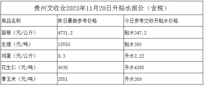 贵州交收仓2023年11月20日升贴水报价(含税)