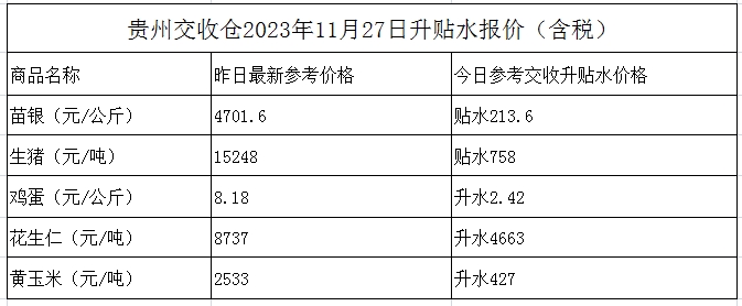 贵州交收仓2023年11月27日升贴水报价(含税)